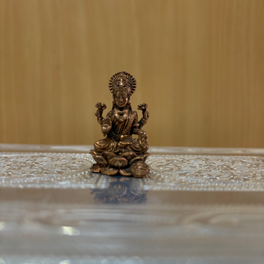 Carefully sculpted in pure copper, this miniature idol of Mahalakshmi is perfect for those who want a powerful yet compact spiritual presence in their home or office.